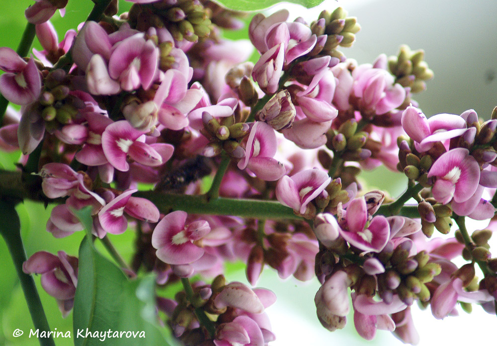 Кора морщинистая, с неприятным капустным запахом. Листья непарноперистосложные, с 4-8 парами листочков. Цветки ярко-розовые, собраны в кистевидные соцветия до 60 см длиной. Плоды не характерные для бобовых, костянкоподобные.