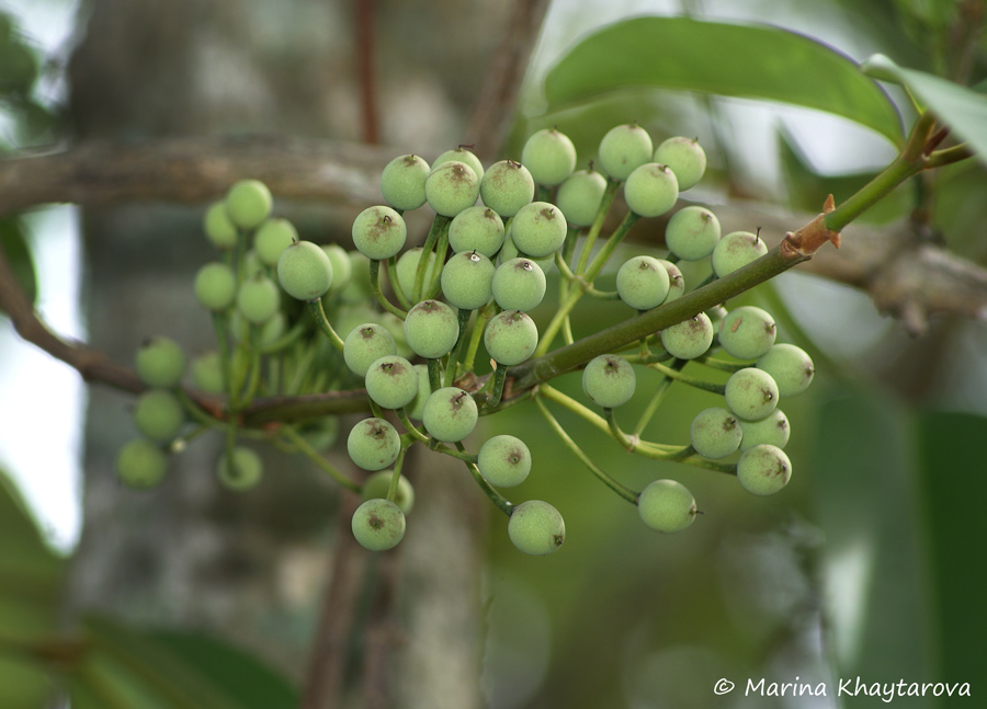 Тропическое дерево до 25 м высотой, с прямым стволом и густой компактной конической кроной. Кора грубая, желто-коричневого цвета. Листья простые, супротивные, цельные, кожистые, глянцевые, овальной или эллиптической формы, с клиновидным основанием и заостренным кончиком, до 30 см длиной. Молодые листья розово-желтого цвета, с возрастом становятся зелеными. Цветки белого цвета с яркими желтыми тычинками, около 10 мм в диаметре, собраны в пазушные сложные зонтичные соцветия. Плоды - шаровидные костянки зеленого цвета, созревая, становятся черными. Не ядовиты.