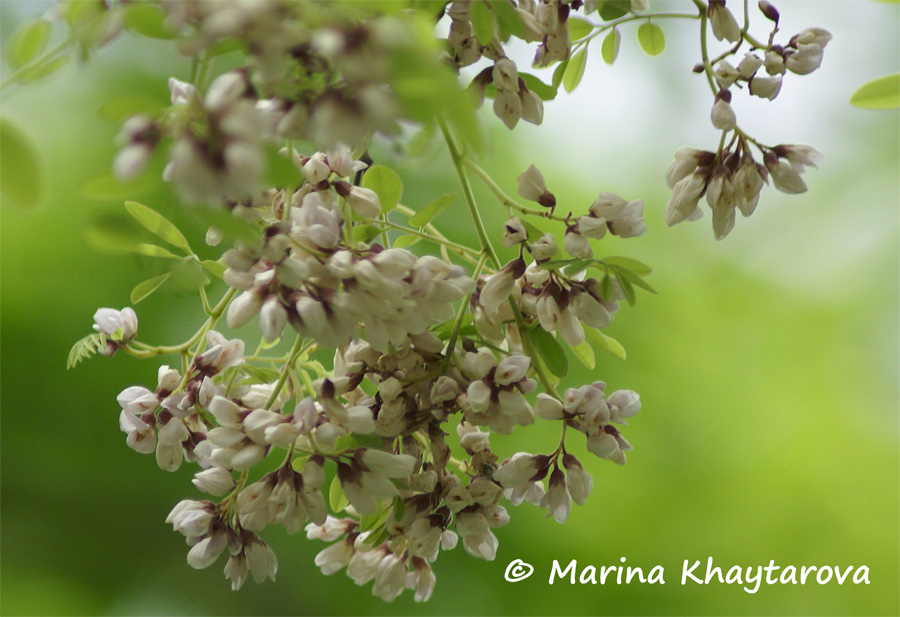Мелкие, бледно-сиреневые цветки собраны в метельчатые соцветия. Плоды - плоские зелёные стручки, высыхающие со временем, внутри которых находится обычно одно, редко два или три красно-коричневых семени.