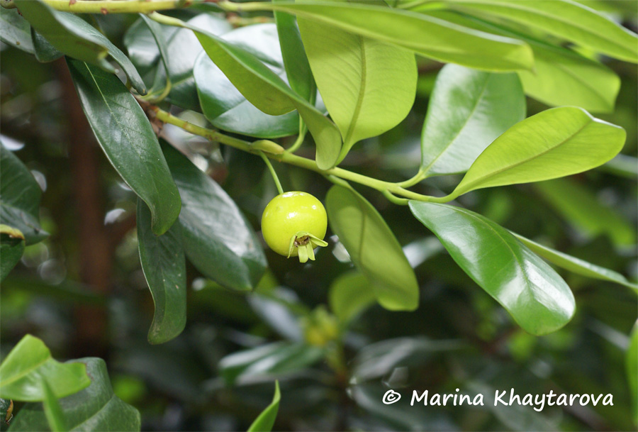 Стройное дерево высотой до 11 м высотой. Кора серо-коричневая, шершавая. Листья супротивные, глянцевые, эллиптической формы, часто с притупленным кончиком, до 16 см длиной, зеленого цвета. Молодые листья желтовато-розового цвета. Цветки одиночные, с четырьмя белыми лепестками и многочисленными тычинками. Плоды шаровидной формы, до 2,5 см в диаметре, на длинных плодоножках. Цвет плода меняется в процессе созревания от зеленого до ярко-красного, фиолетового (почти чёрного) или жёлтого. Мякоть плода красного, розового или белого цвета, сочная, с вишневым ароматом, богата фосфором и кальцием. Вкус кисло-сладкий.