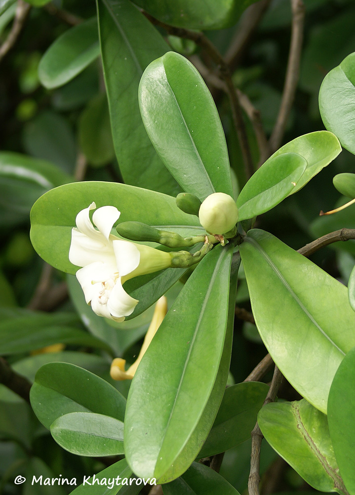 Tропический кустарник или невысокое дерево, до 15 м высотой. Листья супротивные, простые, цельные, кожистые, блестящие, тёмно-зеленого цвета, эллиптической или обратнояйцевидной формы, до 25 см длиной. Цветки кремово-белые, трубчатые, воронковидные, до 6 см в диаметре, одиночные или собранные в щитки, душистые. Плод - ягода овальной формы, до 4 см длиной.