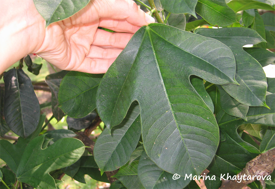 Вечнозелёныей кустарник или небольшое дерево, до 6 метров высотой. Листья тёмно-зелёные, глянцевые, по форме бывают трёх типов: овальные или эллиптические, напоминающие скрипку и трёхлопастные. Молодые листья имеют бронзовый оттенок. Цветки алые, с пятью лепестками, собраны в кисти. Цветение круглогодичное.