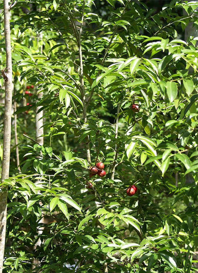 Невысокое дерево до 5-7 метров высотой, с разветвленной кроной и светло-серой, гладкой корой. Листья ярко-зелёные, до 10 см длиной, эллиптической формы, с ровными краями и острым кончиком, гладкие. Мелкие, белые, ароматные, трубчатые цветы собраны в соцветия по 2-4 цветка. Плоды округлые, напоминающие яблоки, 3-7 см в диаметре, зелёные, созревая становятся красно-бордовыми. Мякоть плодов белая, волокнистая, водянистая. В сыром виде очень ядовита!