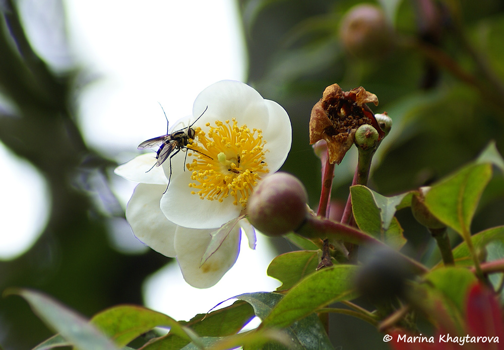 Вечнозеленое дерево до 35 м высотой с густой плотной кроной. Ствол прямой, часто с контрофорсами. Кора коричневая, серо-коричневая или серая, грубая, с глубокими продольными трещинами. Листья кожистые, глянцевые, гладкие, тёмно-зеленого цвета, до 18 см длиной, продолговато-эллиптической формы, с заостренным, слегка вытянутым кончиком и ровными (редко слегка зубчатыми) краями. Молодые листья густо опушены и имеют бронзово-красный оттенок. Цветки душистые, до 5 см в диаметре, одиночные или собраны в соцветия по несколько штук, с пятью белыми округлыми лепестками и многочисленными жёлтыми тычинками. Плоды - деревянистые растрескивающиеся на 5 частей капсулы шаровидной формы, до 3 см в диаметре.